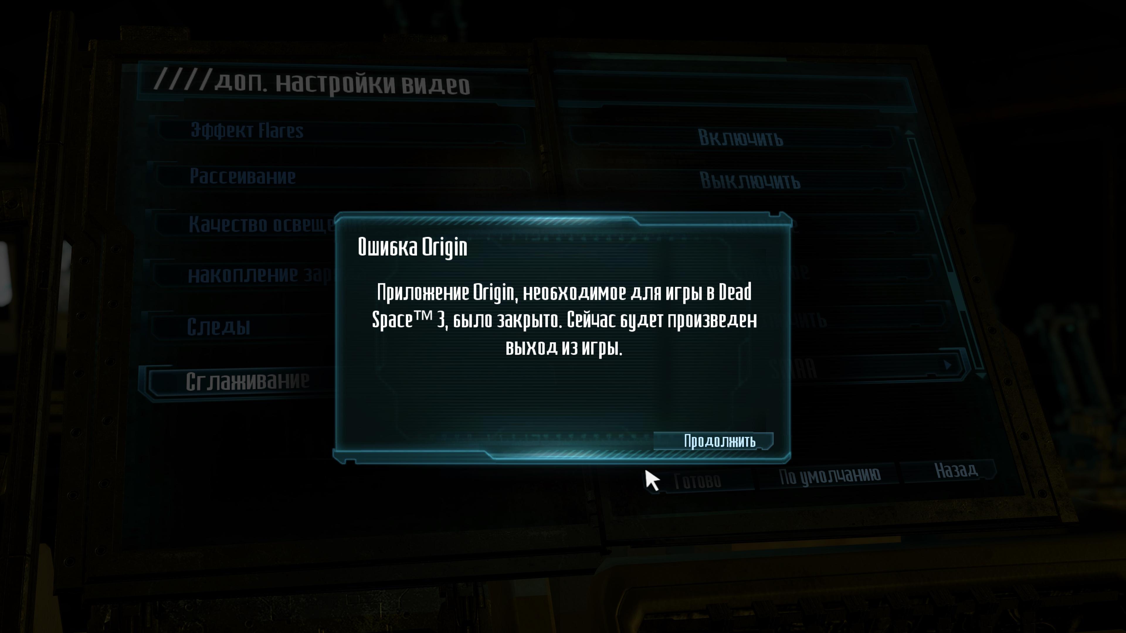 Добрый день! Скачал, установил и авторизовался в ZClient и ZLOrigin. В ZLOrigin скачал Daed Space 3 в игру заходит делаю настройки или просто нахожусь в меню и через какое-то время вылазит ошибка и игра закрывается! Описание ошибки: "Ошибка Origin. Приложение Origin, необходимое для игры Dead Space 3, было закрыто. Сейчас будет произведен выход из игры.". Кроме кнопки продолжить других вариантов нет, после ее нажатия игра закрывается. Неважно сколько раз пробовал все повторяется! Скриншот ошибки приложу. Надеюсь на вашу помощь заранее благодарю!
